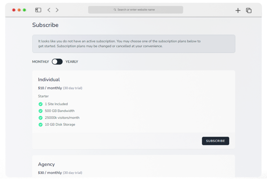 Step 4: Select Your Plan: There are different Website hosting plans available – Individual, Agency, and Enterprise. You can also choose whether you want to select a monthly or yearly subscription.